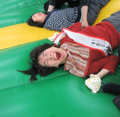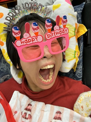 皆でバースデーソングを歌った後は、大好きなエアトランポリンでお祝いです!空気で膨らませたトランポリンの上で、ポヨンポヨンと飛んだり跳ねたり…!思わず笑顔があふれているようでした。他の利用者様も一緒に乗り、普段感じることのない感覚に、キョロキョロしたり、笑ってしまったりと皆で楽しみました!