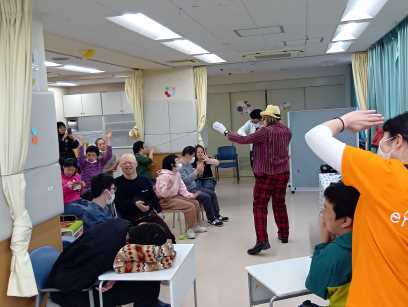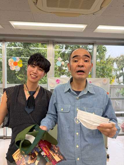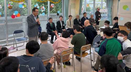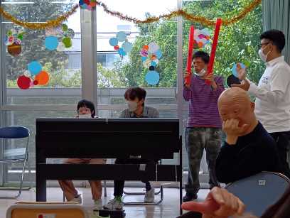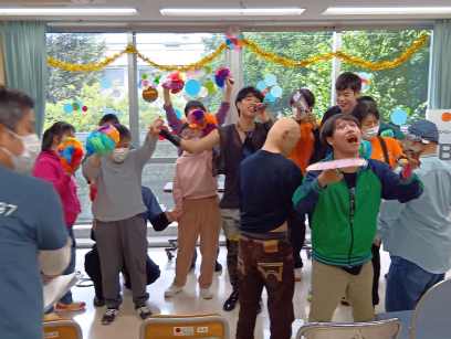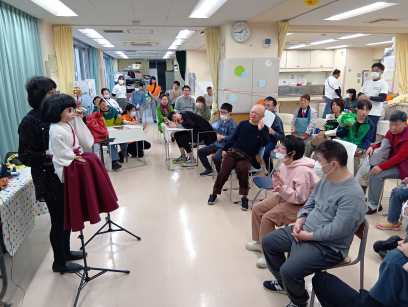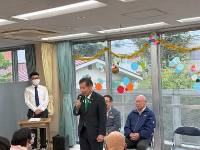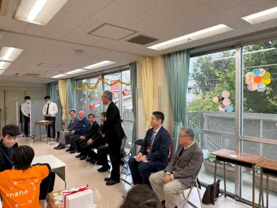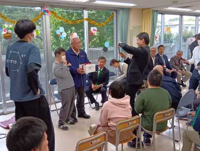 午前は、音楽身体表現の発表会を行い、毎月講師で来ている、イーガルさんと一緒に事前に練習した楽器で演奏し日頃の活動の成果を皆の前で披露しました。 午後は、青木区長、鈴木目黒区議会議長、石塚町会長、保坂健康福祉部長、鈴木目黒区事業団理事長が来園し、駒場町会からの雑巾作成注文完成受け渡しセレモニーも行なわれました。