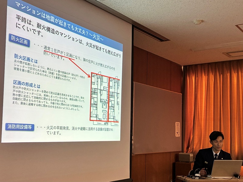 今回は、目黒消防署の方にお越しいただき、マンションならではの地震や火災対策についての講話を