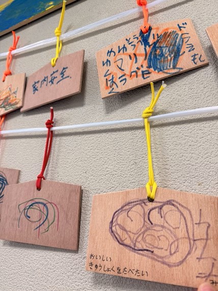 利用者のみなさんと一緒に絵馬づくりを行い、それぞれの想いや願いを込めて鳥居に飾っています。