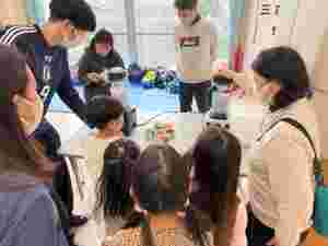 細かくした牛乳パックのパルプと、色を付けるためのお花紙や食品作業で出る玉ねぎの皮などを使って一緒にミキサーにかけます。型に流し入れたりタオルを使って水分を取ったりと、どの工程も興味津々で楽しそうに参加されていました。ご利用者さんたちも、それぞれ役割をもって園児さんたちに接して、心温まる交流会となりました。